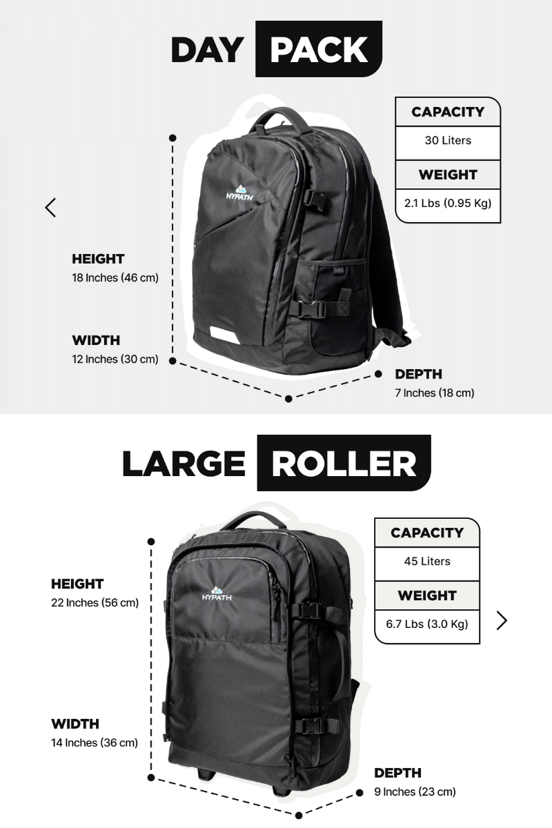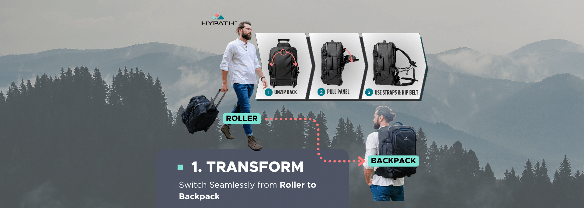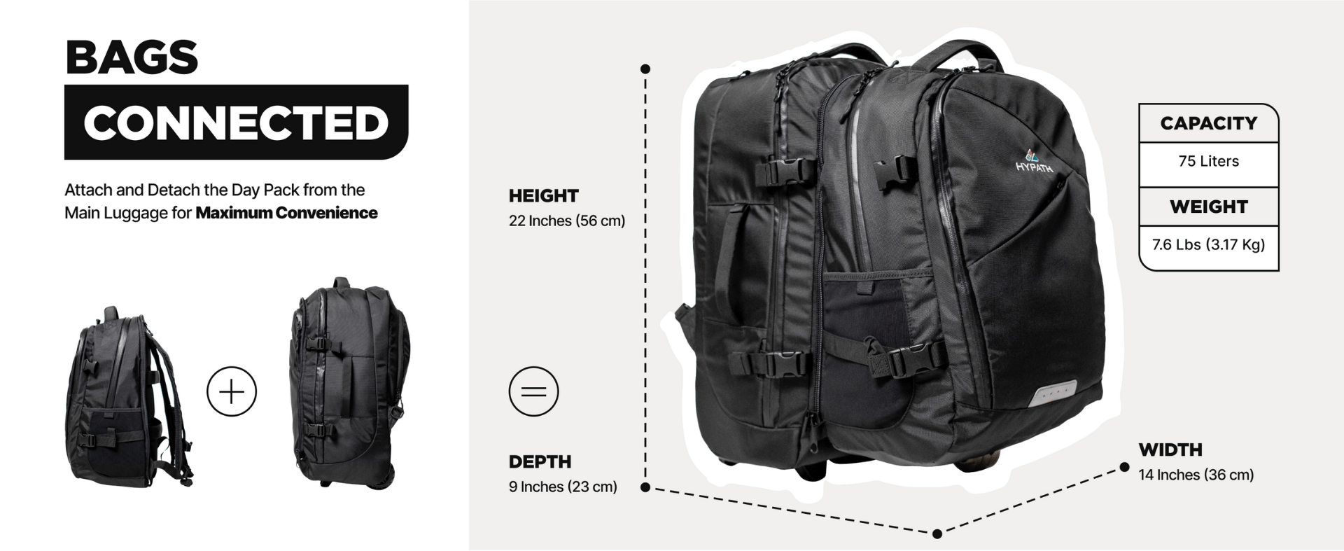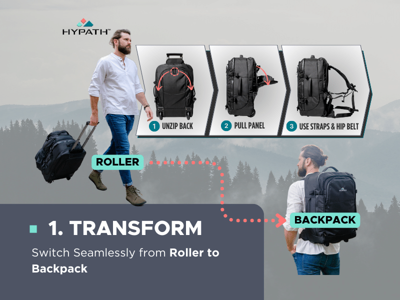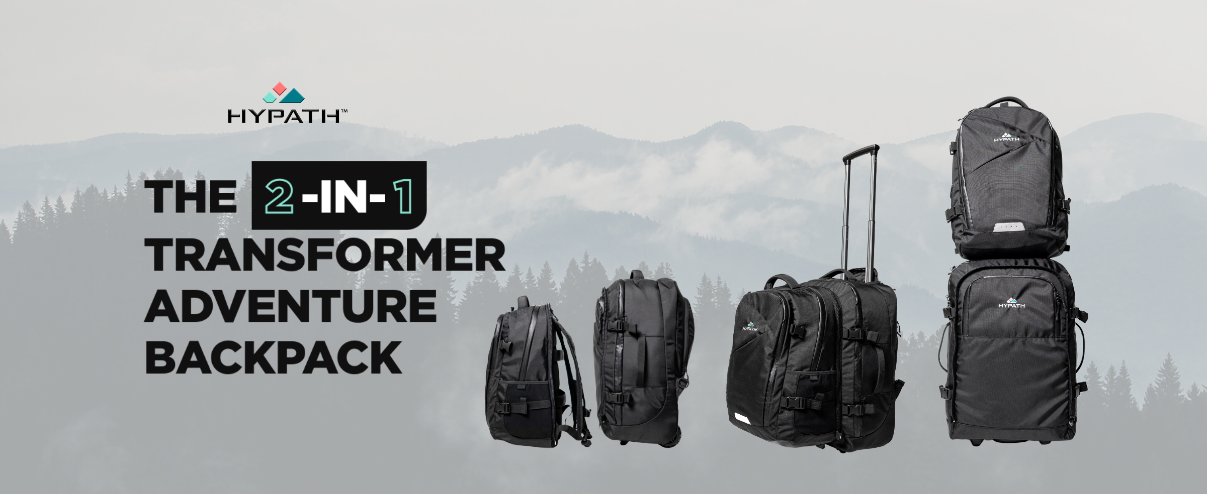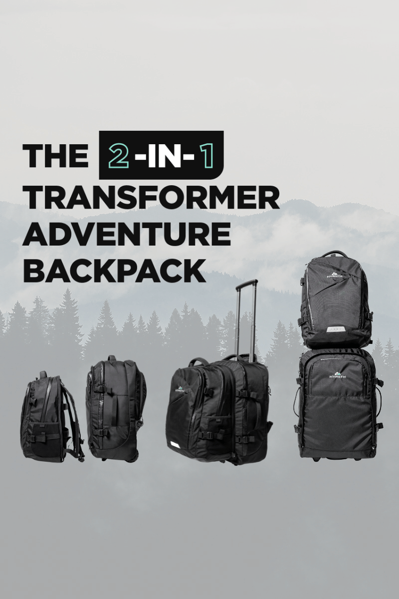 The Hypath Transformer Backpack can be used as a wheeled carry-on sized luggage, backpack, or a combination of both. This provides versatility and adaptability to any travel situation.