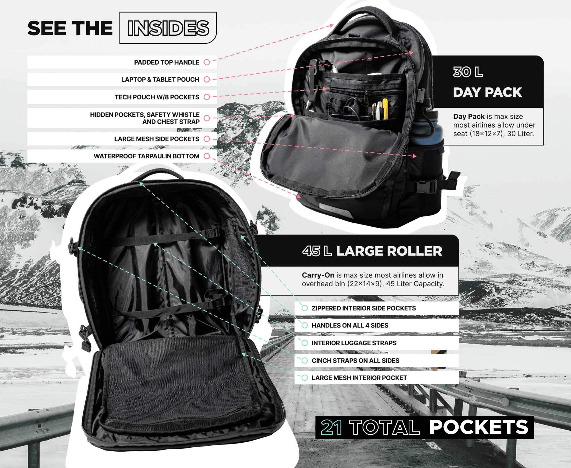 “The bags are designed around functionality and perform as the largest carry-on and personal bag you'll find anywhere in any configuration (my humble opinion based on years of traveling)”