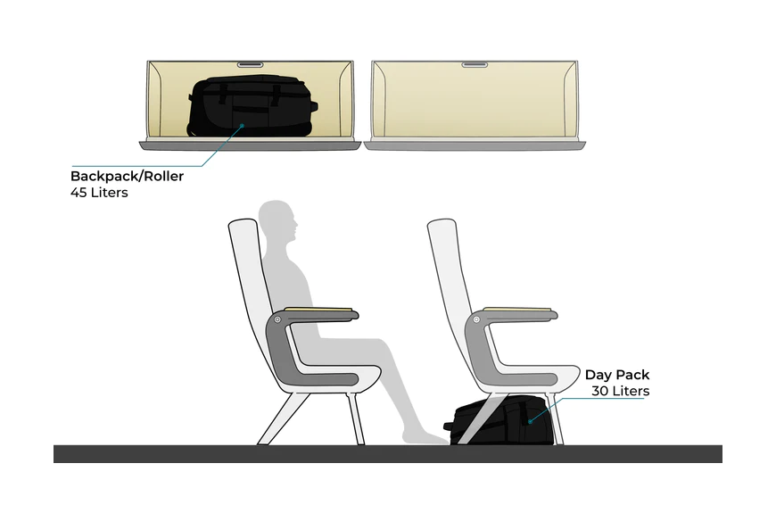 The larger wheeled bag is the absolute max most airlines will allow in the overhead bin, and the detachable day pack is also the absolute max most airlines will allow for under seat storage.