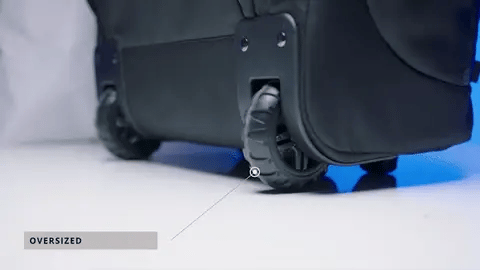 The oversized, treaded wheels provide smooth navigation over any terrain. The base also includes a grab handle, and angled feet to help prevent tipping while the luggage is standing.